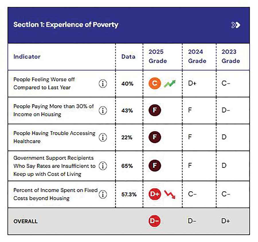 The Poverty Report Card grades the federal government based on a number of factors including people’s experience of poverty, measurements of poverty, a standard of living and the government’s progress on passing anti-poverty legislation. It included assessment on the percentage of income people spend on housing and fixed costs beyond housing. Forty-three per cent of respondents, for instance, said they’re paying more than 30 per cent of their income on housing, which earned the government a grade of F.