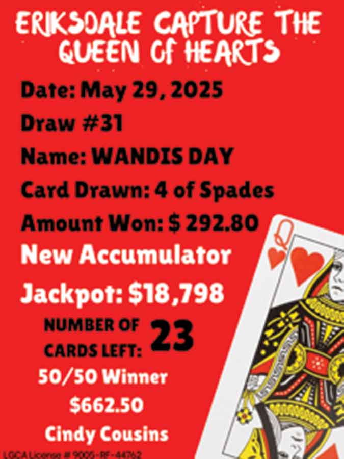 The eight participating groups — the Eriksdale Active Living Centre, Legion, Community Club, Curling Club, Métis Association, Firefighters Association, New Horizons and RogerKimLee Music Festival — will share the proceeds equally once the queen of hearts card is found. A 50/50 draw is also held each week.