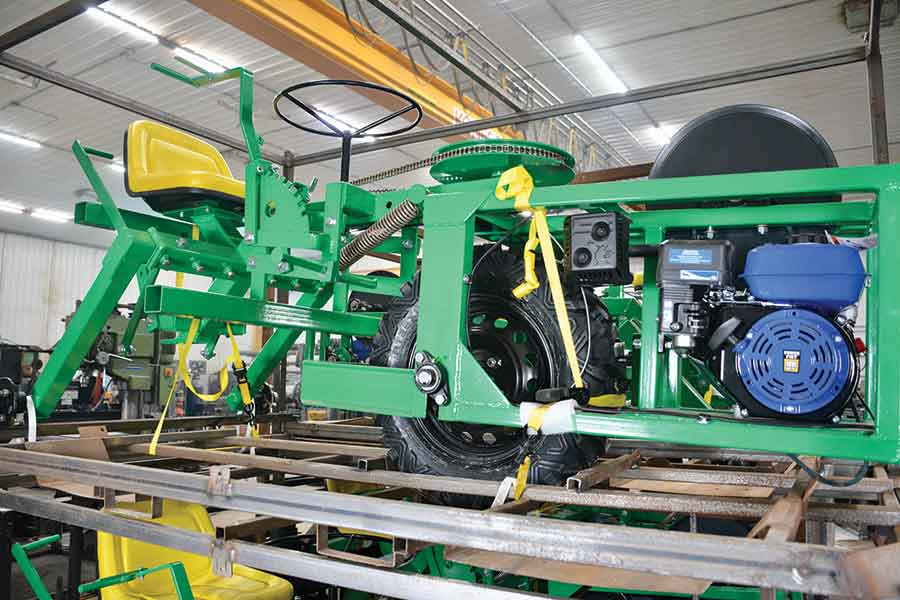 The tractors are powered by 212cc motors from Princess Auto and built from mild steel, including box tubing, angle iron, round shafts and bushing materials. Each machine fits into a four-by-four-by-eight-foot frame and is described as “easy to use”—any simpler, and it would no longer be effective. Each tractor took about 70 hours to assemble and pack.