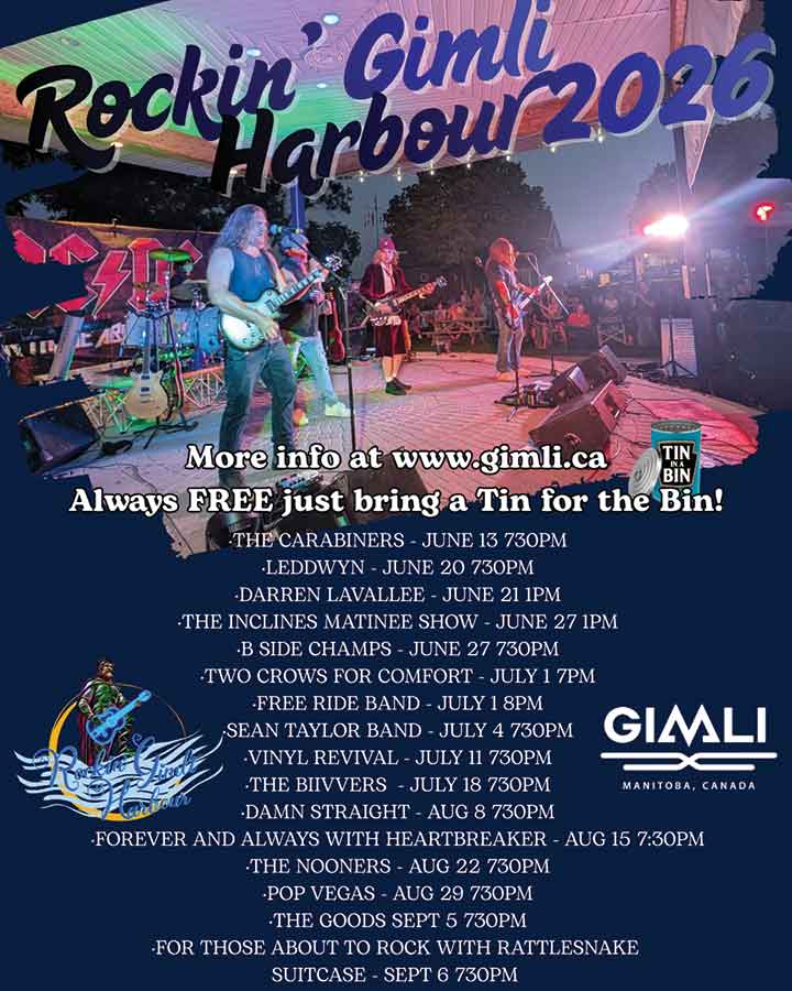 The RM of Gimli’s tourism department finalized a lineup of free musical entertainment that includes Leddwyn, Two Crows for Comfort, Free Ride Band, The Bivvers and Pop Vegas.