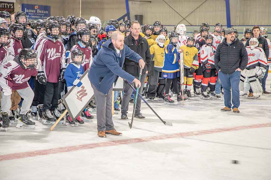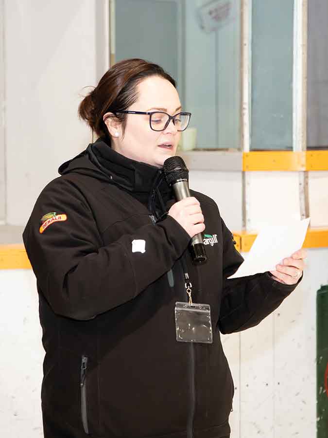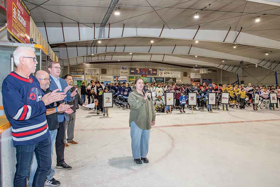 Opening ceremonies featured guest speaker Kay Bugg, a Cargill representative from Reston, ceremonial puck drop by Chantel Finnbogason and a performance of O Canada by Kiah Bobbee. Members of the Arborg Falcons carried the flags representing the nine competing teams during the ceremony.
