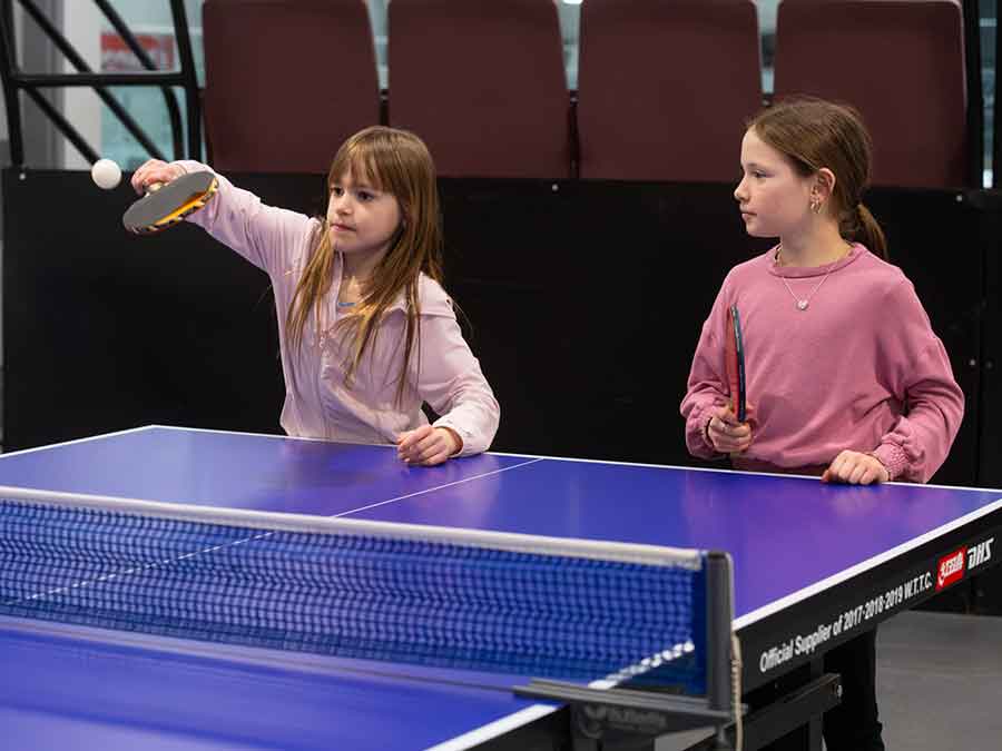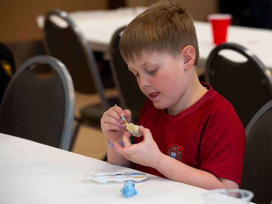 Left: Frankie and Fern try their hand at table tennis last Tuesday afternoon  during the Spring Break Day Camp at the Access Event Centre in Morden. Right: Carter concentrates on his pottery painting the next day. The week also included a tour of the Canadian Fossil Discovery Centre on Thursday.
