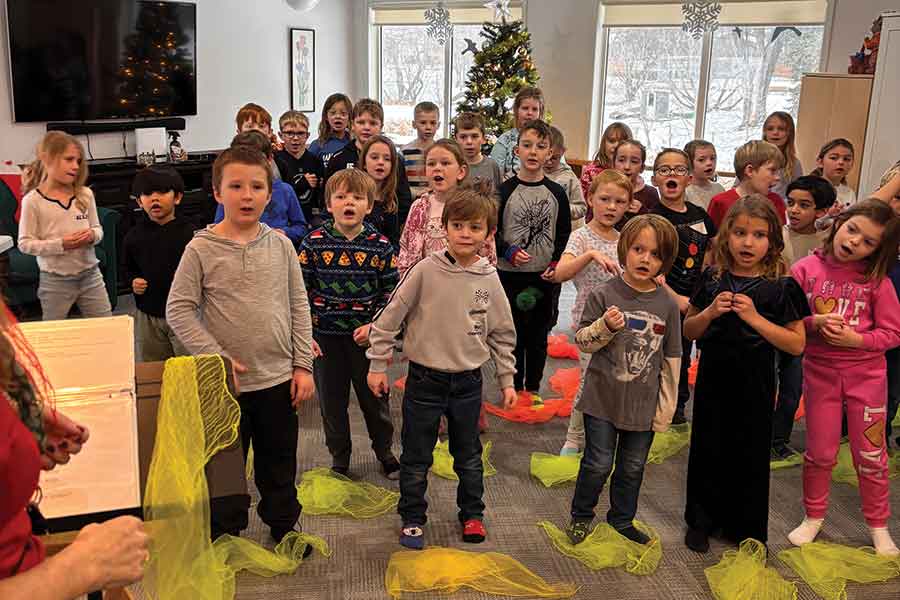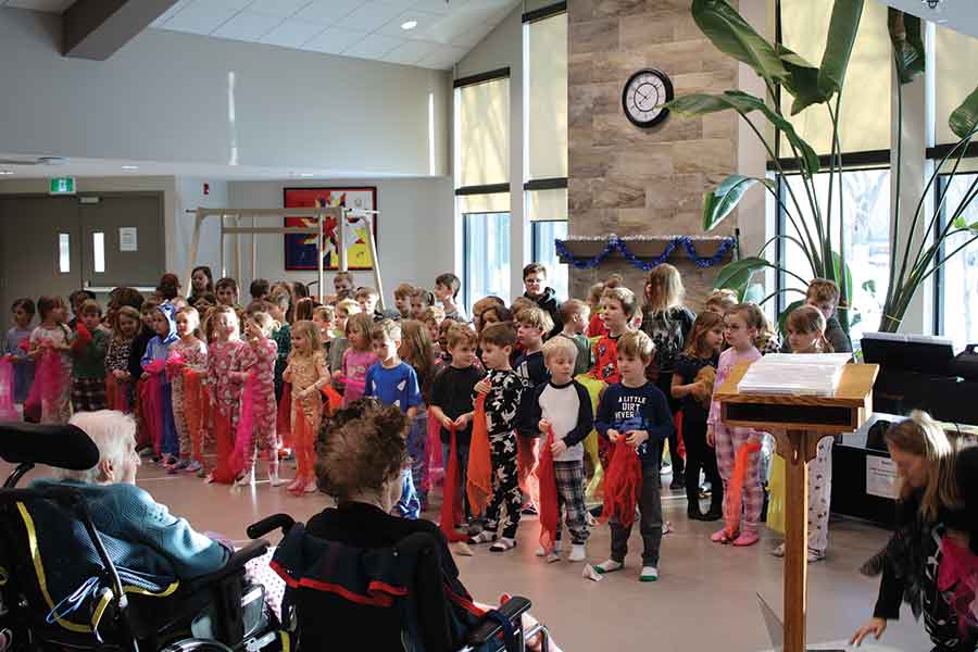 École Carman Elementary School students from multiple classes — including Grade 1 (1S) and Grade 2 (2M) — performed a seasonal concert for residents and guests at the Riverview Legion Lodge apartment complex in December. On Jan. 9 students from four classes — Kindergarten French Immersion (KS) and Kindergarten English (KM), Grade 1 (1S) and Grade 2 (2M) performed a second one for Boyne Lodge residents. Under the direction of music teacher Mrs. Myrna Klassen, the students sang a seven-song set featuring Falling Leaf, Blowing in the Wind, It’s Snowing Outside, Hot Chocolate, Snowflakes in the Air and Pretty Snowflakes, before closing with Jingle All the Way. The performance included scarves, choreographed actions and percussion instruments such as jingle bells and homemade shakers created in class.