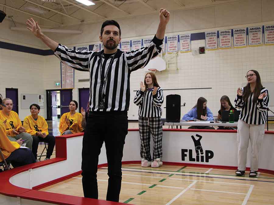 On Thursday, Oct. 30, the local school welcomed participants involved in FLIIP (Fabuleuse Ligue d’Improvisation Immersive et Passionnante) from Collège Lorette Collegiate and Collège Béliveau. French immersion students from Stonewall Centennial formed the audience for the improvisational theatre tournament, which took place in the high school gym.