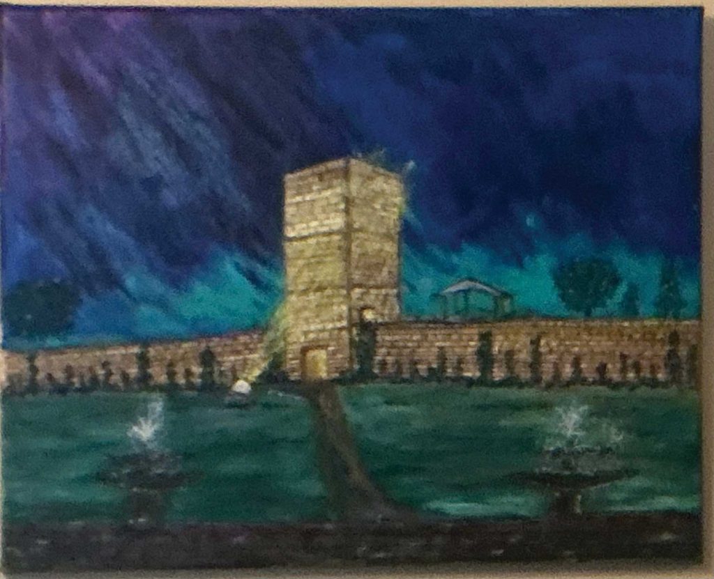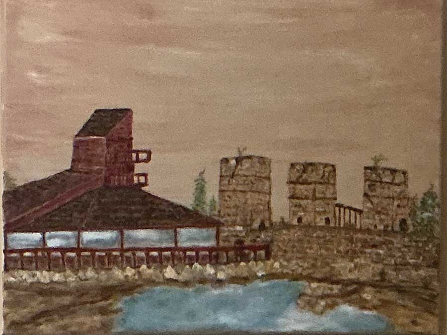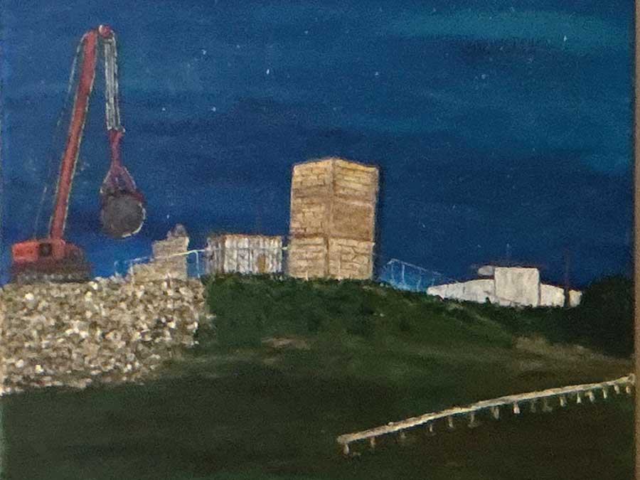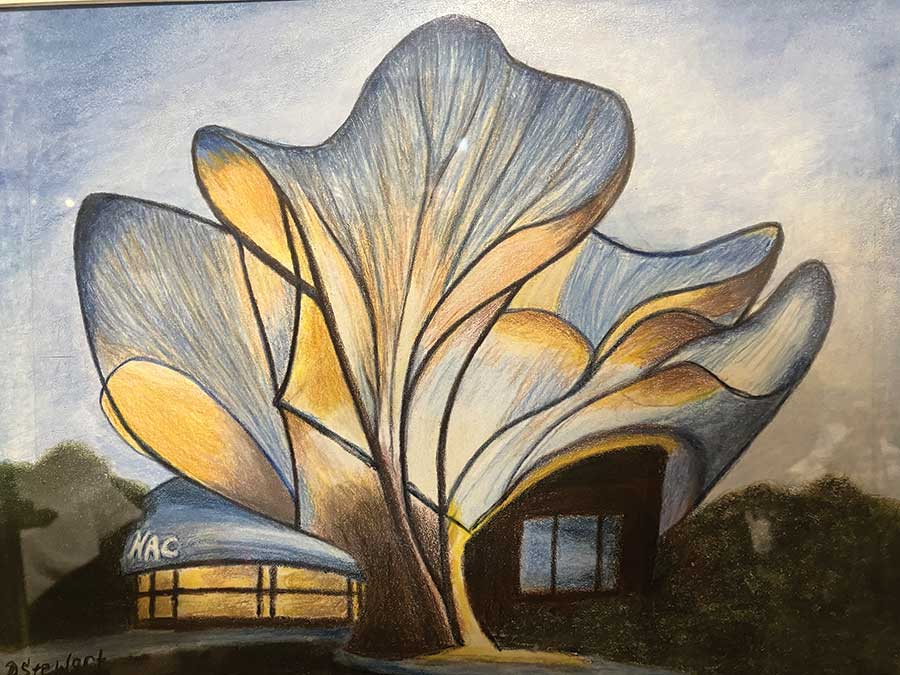 “My past piece –– from approximately 1995 –– shows the original burned-down HAC with our grouping of three kilns showing their age,” Mackinder explained. “My present piece depicts the first rebuilt kiln and the construction site around it, with the demolition work on kiln two and three nearly complete. My future piece shows the one lonely rebuilt kiln as well as the new plaza,” he said.