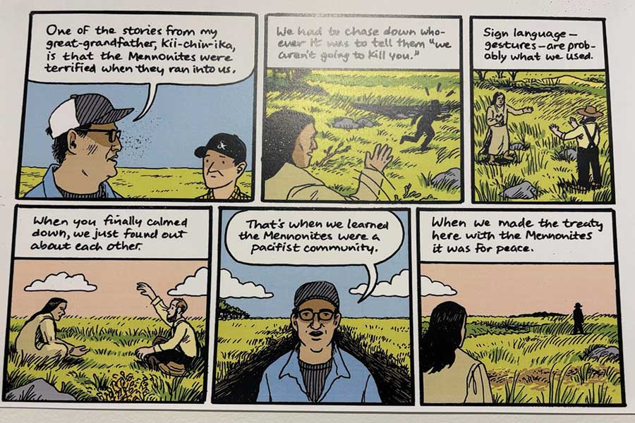 It revolves around Ojibwe stories from the land that Mennonites came to call the west reserve and stories of those early encounters between European newcomers and Indigenous peoples. Swan Lake First Nation knowledge keeper David Scott teamed up with artist-illustrator Johnathan Dyck, who is originally from Winkler, to create the graphic novel.