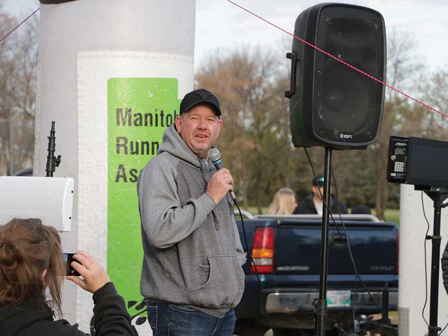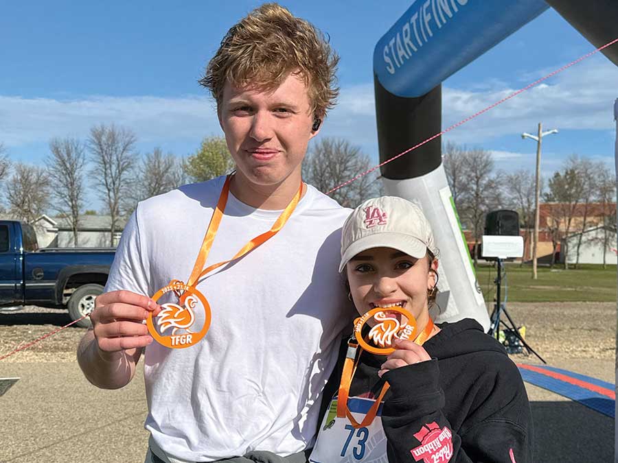 Runners of all ages and skill levels gathered outside Winkler’s Meridian Exhibition Centre Saturday morning for the 19th annual Thanks for Giving Run. The day’s races through town included a half marathon, 10k, 5k, and even a 1.2k route for the kids. Proceeds from the day go to support the Winkler and District Food Cupboard. Its chair, Milt Olfert (left), shared that those welcome funds make up about 10 per cent of their operating budget for the year. Right: Among the racers in the 21k half marathon were Julianna Harder and Bronson Fehr, shown here proudly displaying their finishing medals. Fehr crossed the finish line in two hours, two minutes, while Harder joined him 20 minutes later.